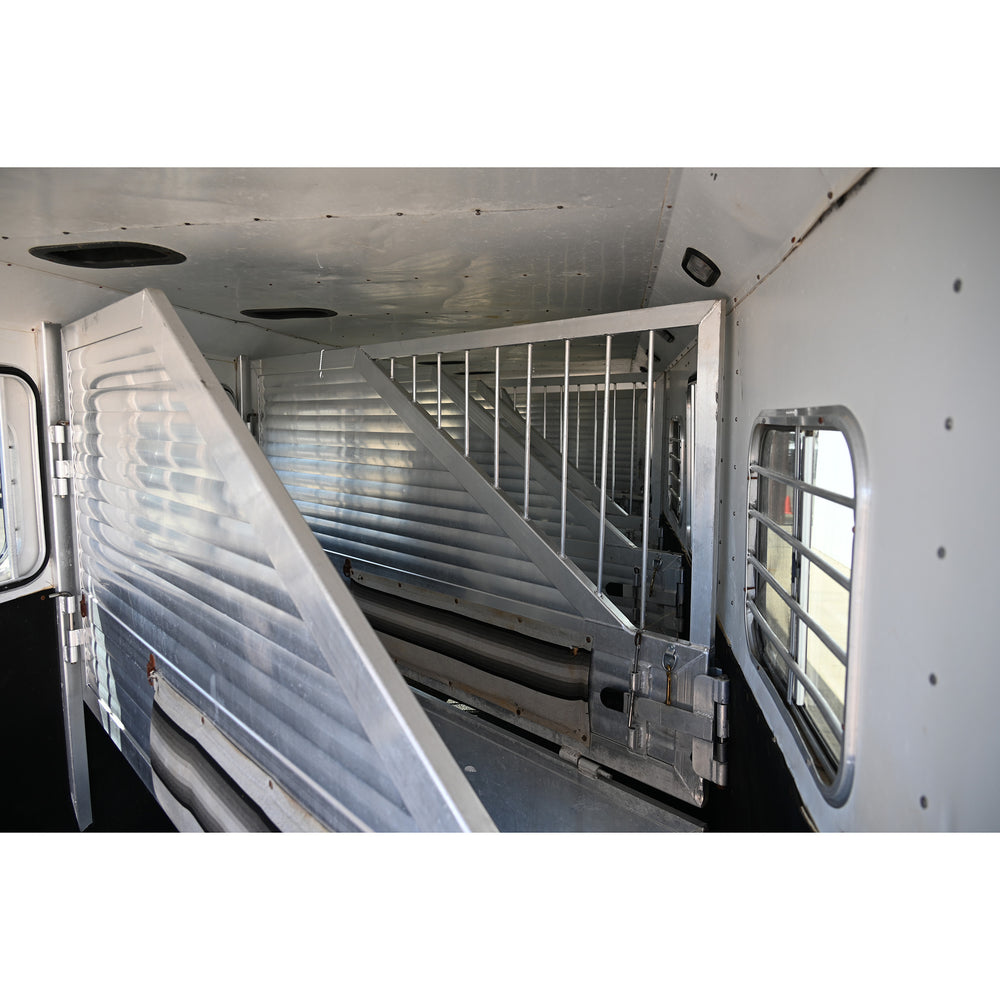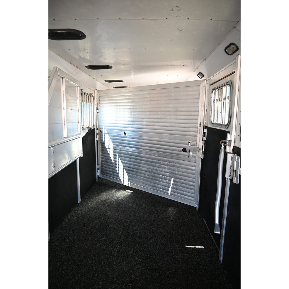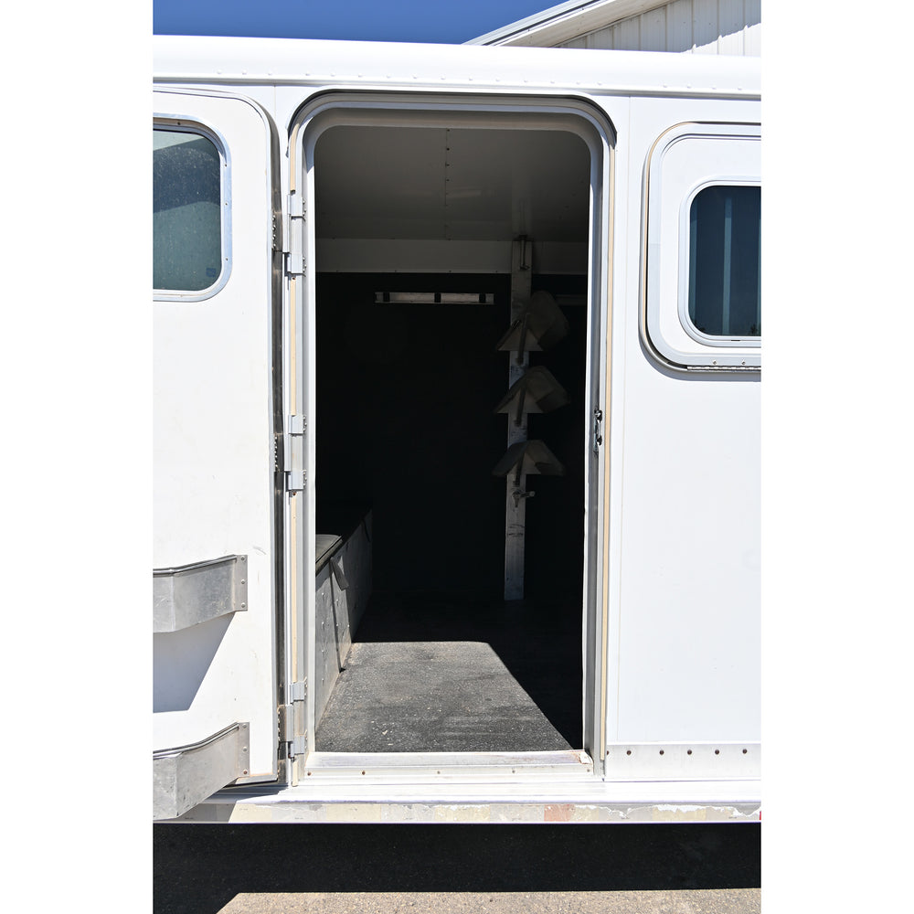The 2001 Sooner 7 Horse Trainer’s Trailer is spacious and built for hauling a large load or horses. With a 7-horse slant load configuration, including 3 stud stall slants, it offers flexibility and security for transporting a variety of horses. This trailer features full double rear doors for easy loading and unloading, along with a large front dressing room/tack room that provides tons of space for gear, saddles—perfect for trainers, show teams, or anyone hauling multiple horses regularly.