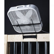 Tough 1 Box Fan HolderKeep your horse cool and comfortable in the summer heat with this folding box fan holder! Perfect for taking to horse shows, this steel holder is designed to hold the fan at a downwards angle for optimum air flow. Includes nylon strap for securing fan in place. Fits a single standard box fan and attaches to walls approximately 2” wide.