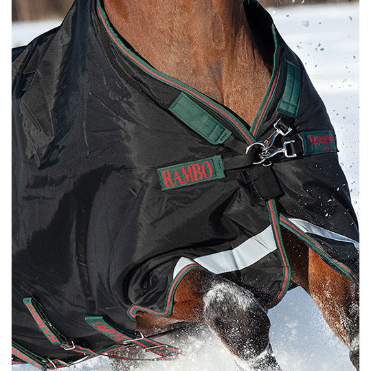 Horseware Rambo® Original Turnout Blanket with Leg Arches (200g Medium) - Black/Green/Red - 72" is currently out of stock. You may still purchase this item, and we will contact you after your order is placed to provide an estimated shipping date.