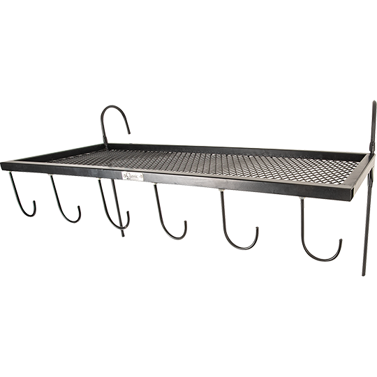 Classic Equine Arena Shelf with Bridle HooksThe Arena Shelf helps keep all your ropes or tack organized. The metal shelf has a flat mesh top to store grooming supplies. Six hooks extend below the shelf to hang ropes, headstalls, halters and more. Hang the shelf over your arena fence for easy access. Fits over any pipe fence up to 3" diameter.