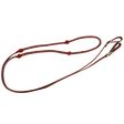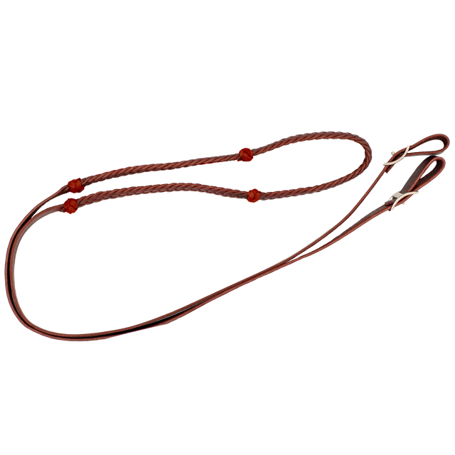 These reins are crafted from premium five-plait braided Latigo leather, known for its strength and flexibility, providing excellent control and a secure grip. Four latigo knots along the reins offer added extra grip. The reins are fitted with a scissor snap for easy attachment, along with Conway buckles for adjustable length, allowing for quick modifications and a perfect fit. Measuring 5/8" in width and 80" in length, these reins are perfect for barrel racing.