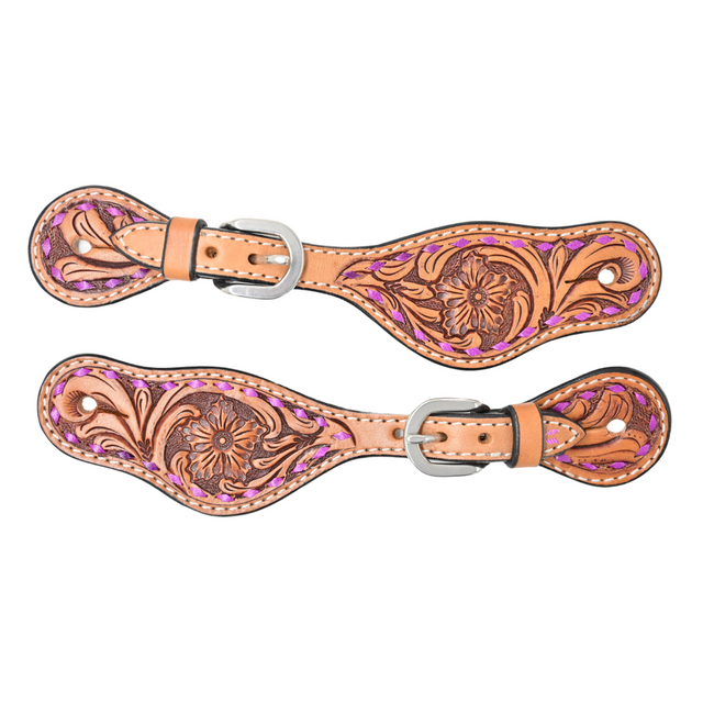 Made from high-quality, durable skirting leather, these youth-sized spur straps feature a beautifully crafted, intricate floral tooled pattern. The stylish purple buckstitch border adds a pop of color, while adjustable buckles ensure a secure and customizable fit. Designed specifically for younger riders, these straps offer a comfortable fit during riding. With high-quality craftsmanship, they ensure long-lasting use and reliability.
