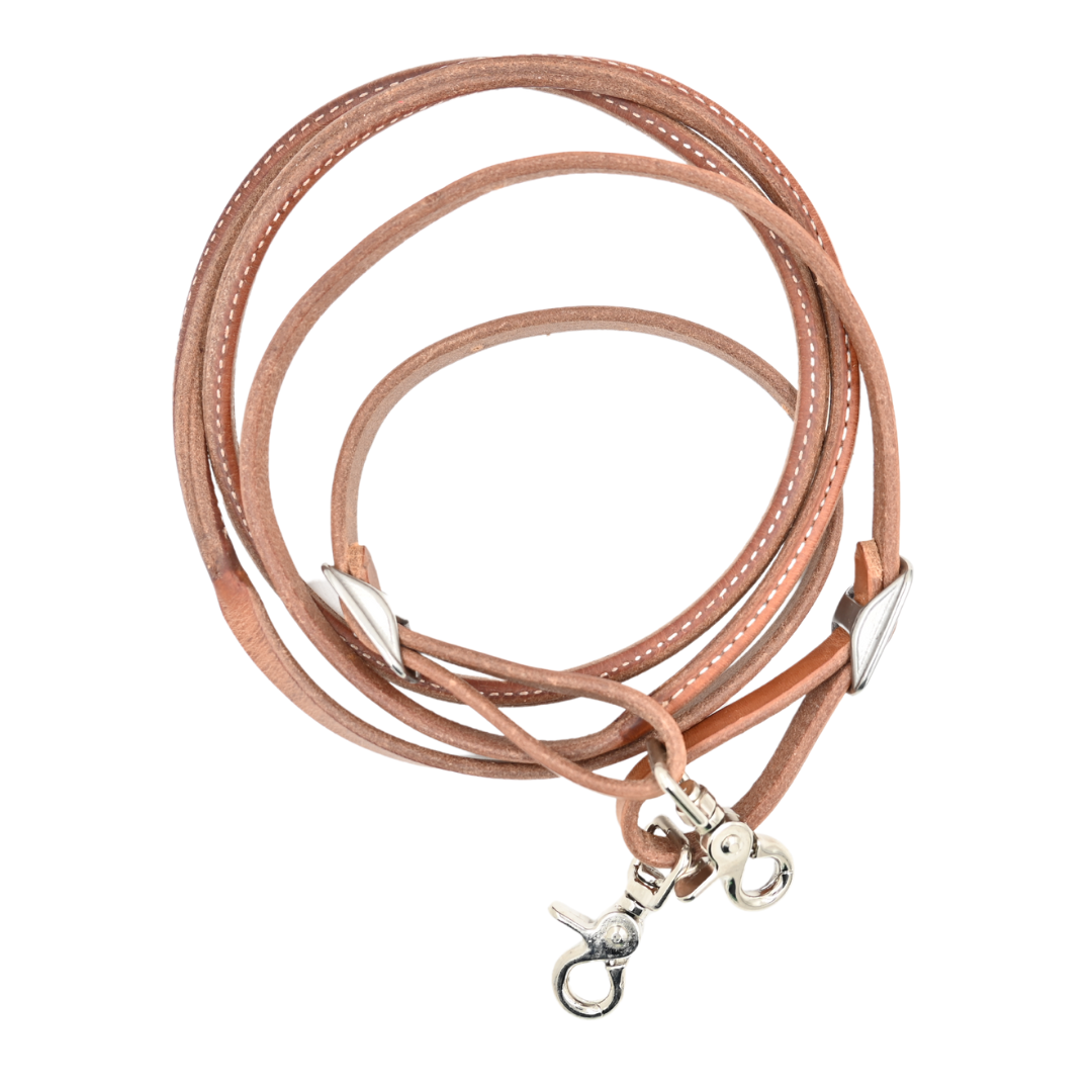 Made from premium brown harness leather, these reins are round-sewn for a supple and comfortable feel. They feature two Conway buckles at both ends for easy adjustments and one scissor snap for quick and secure attachment. This construction ensures durability and flexibility, making them an ideal choice for various riding activities.